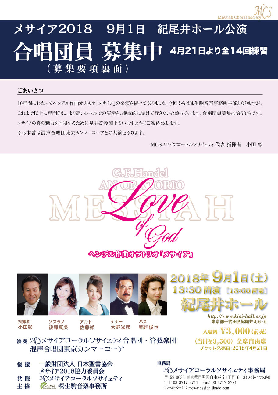 G・F・ヘンデル作曲 オラトリオ「メサイア」の演奏会を主宰いたします。 2018年9月1日 13:30開演 四ツ谷 紀尾井ホール 指揮は、東京カンマーコーアの後援会会長でもある小田彰氏 演奏は、MCSメサイアコーラルソ… 続きを読む ヘンデル「メサイア」